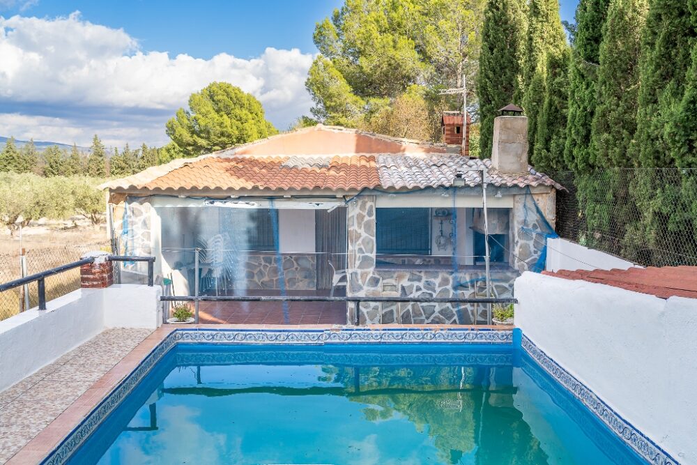 Casa de campo en Onil zona Marjal, 1.300 metros de parcela, 140 metros construidos, 3 dormitorios, comedor, cocina, baño, sótano-bodega. Dispone de piscina, galería y cochera. Luz eléctrica y agua de pozo.