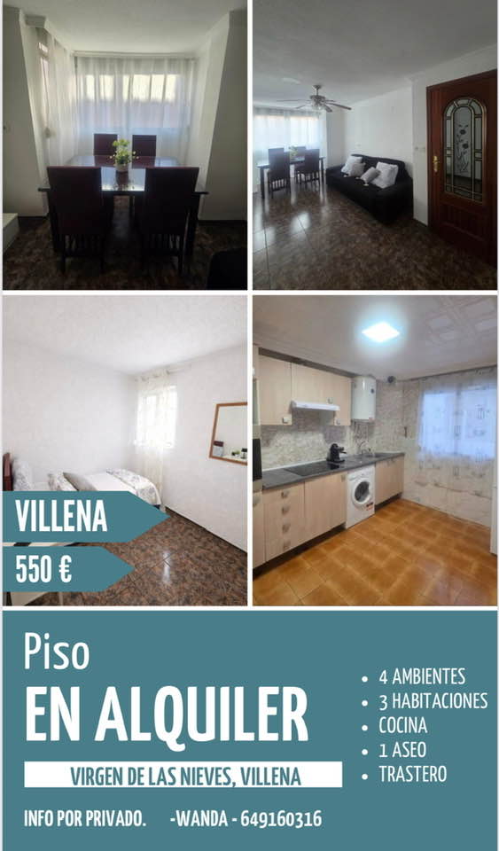 Se alquila piso en Villena por 550€ en la calle Virgen de las Nieves, 4 ambientes, 3 habitaciones, cocina, 1 aseo, trastero. Info por privado