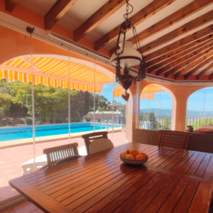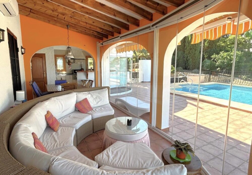 ¡Increíble precio ahora! Espectaculares vistas al mar desde esta hermosa y espaciosa villa, que rezuma el factor de sentirse bien: ¡Lleno de encanto y luz, te sentirás como en casa tan pronto como entres! Esta propiedad única es absolutamente perfecta, y ofrece las mejores vistas al mar y panorámicas: en un lugar tranquilo y soleado ofrece privacidad, espacio y calidad. El nivel principal tiene una gran terraza solar con piscina de 10m x 5m (calefactada), con una fabulosa terraza solar y mucho espacio para tomar el sol, luego una terraza cubierta con vistas a la piscina y al mar, con persiana eléctrica y cortinas de cristal. Aquí también está la cocina de verano, la ducha y el baño. El hall de entrada se abre por un lado al comedor, y una amplia sala de estar con acogedora chimenea y ventanas panorámicas para disfrutar de las vistas al mar, y excelentes puestas de sol durante todo el año.